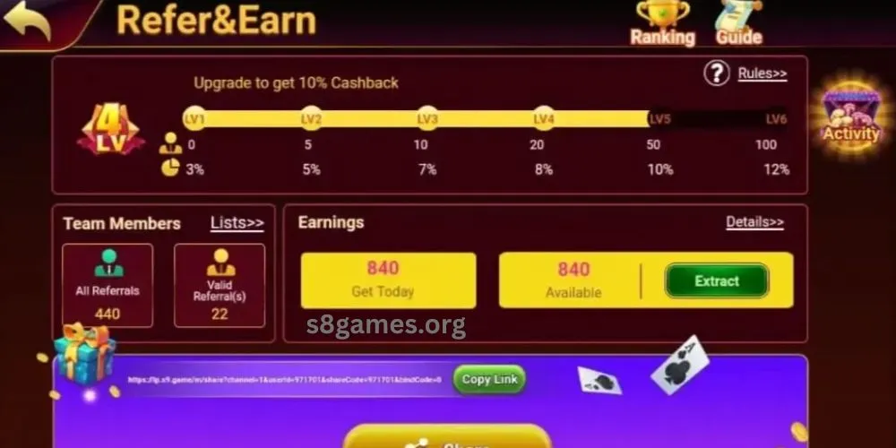 S8 Game is a unique online gaming platform where you can earn real money just by playing games. It offers a variety of card games, allowing players to enjoy exciting gameplay while accumulating earnings. One of its standout features is the availability of free spins and daily bonuses, making it more rewarding than many other games. Additionally, you can increase your earnings by inviting friends to join the platform. This game is a perfect blend of entertainment and financial opportunity.